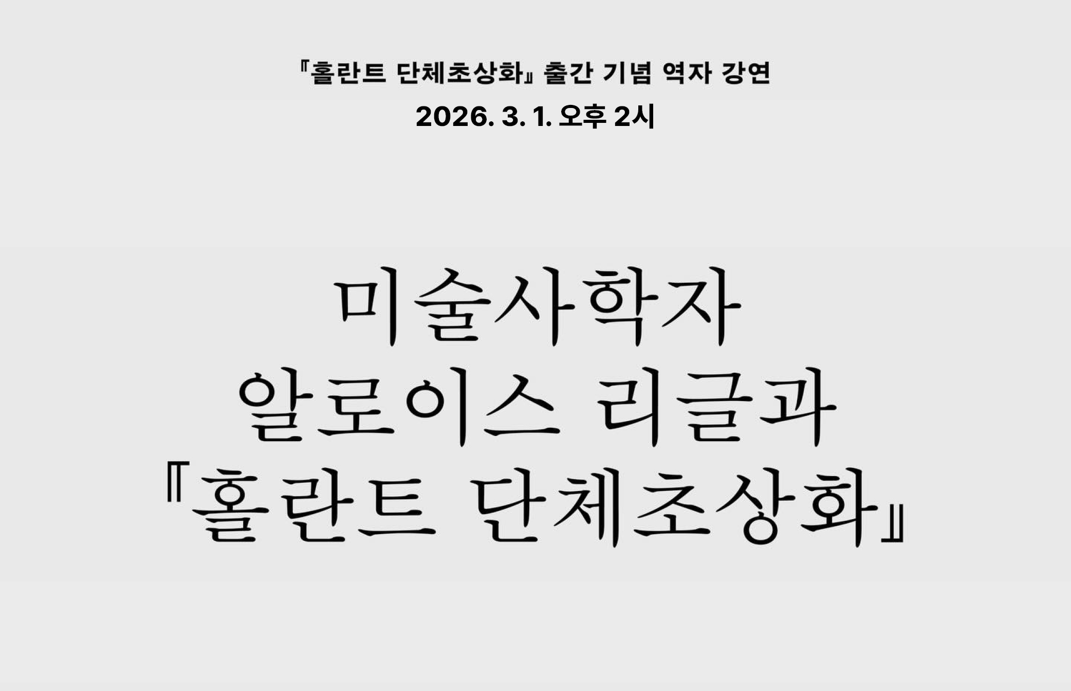『홀란트 단체초상화』 출간 기념 정유경 역자 강연 * 강연 제목 : 미술사학자 알로이스 리글과 『홀란트 단체초상화』 * 일시 : 2026. 3. 1. 일. 오후 2시 * 『홀란트 단체초상화』 책 소개 빈학파를 대표하는 미술사가 알로이스 리글의 『홀란트 단체초상화』는 미술을 개인적 표현이나 자연의 모방으로 설명하는 대신 한 시대의 예술의욕이 시각적 형식으로 조직되는 방식을 탐구한 고전이다. 리글은 장식문양과 공예 같은 ‘순수미술’이 아닌 분야에 대한 연구를 통해 예술을 집합적 역사 경험의 산물로 이해했고, 이 책은 그러한 문제의식이 가장 구체적으로 실현된 후기 저작이다.리글은 이 책에서 17세기 홀란트 단체초상화에 대한 연구로 ‘예술의욕’ (Kunstwollen)이라는 개념을 입증한다. 17세기 홀란트 사회에서는 자경단을 포함한 길드 같은 단체들이 활발하게 결성되었고 그 구성원들을 한 화면에 담은 단체초상화가 다수 제작되었다. 리글에 따르면 17세기 홀란트의 단체초상화는 개인의 위신이나 영웅적 서사를 강조하지 않고 병렬적 구성과 공공적 정체성을 시각화함으로써 시민 사회의 미감과 세계관을 형식화했다. 리글은 이 장르야말로 17세기 홀란트의 예술의욕을 가장 선명하게 드러내는 영역이라고 보았다. 또 『홀란트 단체초상화』는 관람자를 미술사 분석의 핵심 요소로 진지하게 고려한 선구적 작업이기도 하다. 리글이 제시한 ‘주의’(Aufmerksamkeit) 개념은 그림 속 인물들 사이의 관계뿐 아니라 그림 밖의 관람자와 맺는 시선의 관계를 분석 대상으로 끌어들인다.리글의 관점은 이후 발터 벤야민의 미학과 역사철학, 나아가 안또니오 네그리의 미학, 정치철학에까지 영향을 미쳤다. 오늘날 이 책은 미술사 연구를 넘어, 예술과 사회 및 집단적 삶의 형식이 어떻게 맞닿아 있는지를 사유하게 만드는 이론적 고전으로 다시 읽히고 있다. https://galmuri.co.kr/product/365 * 강연자 : 정유경 성신여자대학교에서 서양미술사 석사와 박사 학위를 받았다. 저서로 『문명이 낳은 철학 철학이 바꾼 역사 2』(2015, 공저), 역서로 외젠 비올레르뒤크의 『건축강의』(2015), 브라이언 마수미의 『가상과 사건』(2016), 알로이스 리글의 『조형예술의 역사적 문법』(2020) 등이 있다. * 사회 : 손보미 (다중지성의 정원) * 순서 - 1부여는 말 · 사회자프리뷰어 소감 · 내가 읽은 『홀란트 단체초상화』 성원선 (미술평론가) 손보미 (다중지성의 정원) - 2부정유경 역자 강연 - 3부질의응답과 자유토론닫는 말 · 사회자