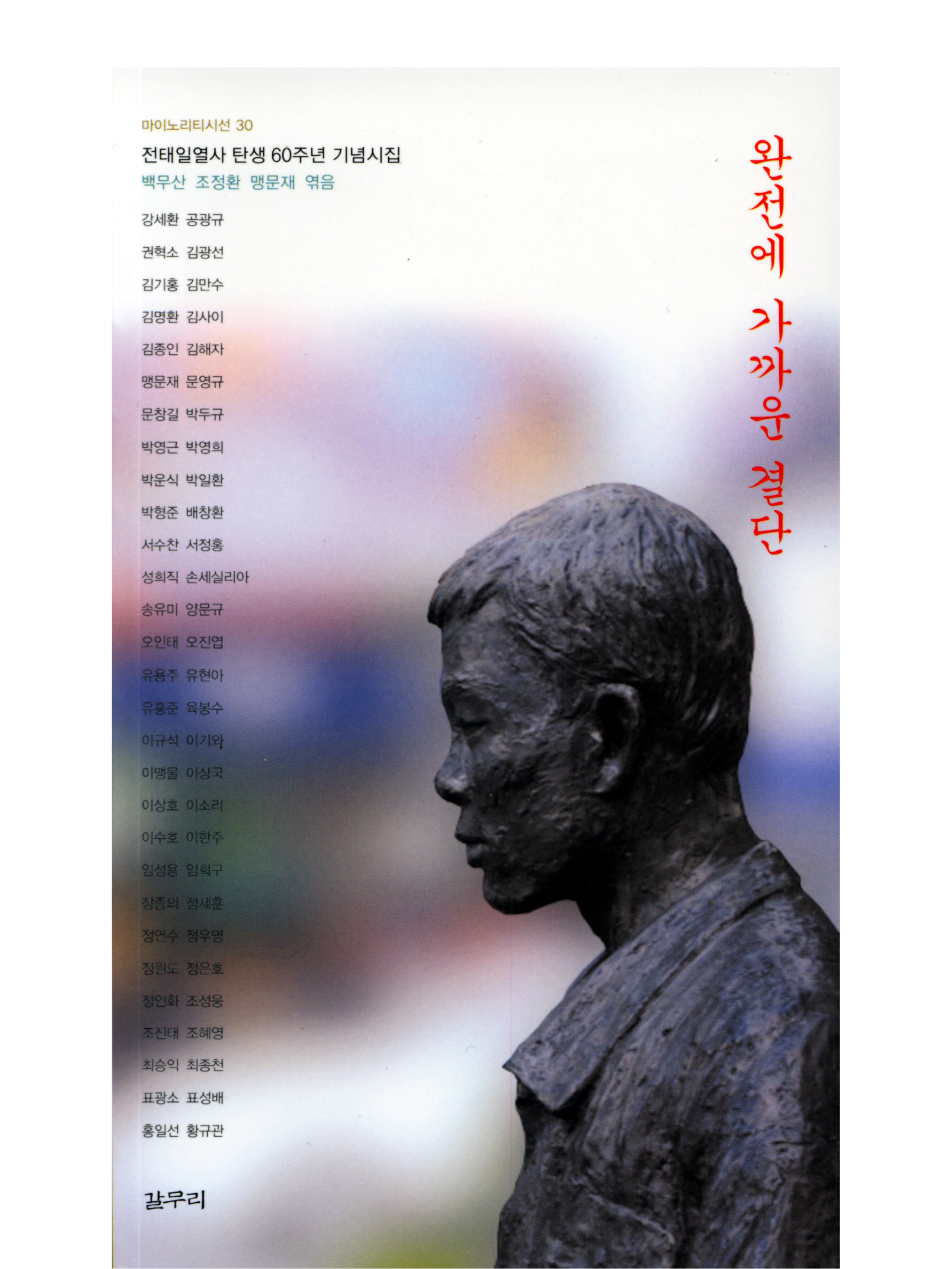전태일 열사 탄생 60주년 기념 시집에 함께해주신 시인들은 모두 삶의 현장에서 온몸으로 살아오신 이 시대 소중한 시인들이다. 이들 시에서 ‘전(前) 단계’ 시대정신의 행간을 발견할 수 있기를 바란다.